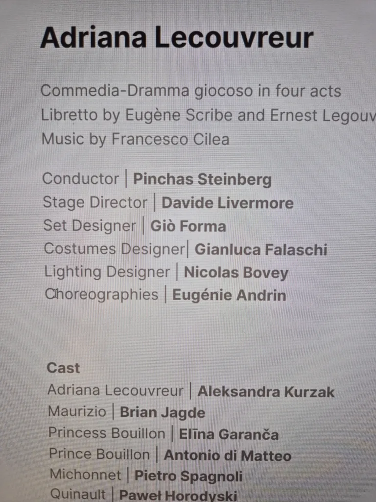 Neapoles operas nams aicina mūs uz patiesiem notikumiem balstītu Frančesko Čilea operu Adriāna Lekuvrēra, operu par mīlestību, greizsirdību un tās sekām 18. gadsimta Francijā. Slavenās aktrises Adriānas Lekuvrēras talantu un skaistumu apbrīno teātra skatītāji, bet apskauž konkurentes. Adriāna ir iemīlējusies Mauricio (Saksijas Moricā), taču viņu attiecības izrādās daļa no traģiska mīlas trīsstūra, kurā izšķiroša loma ir Bujonas princesei (šoreiz loma Elīnai Garančai). Pateicoties izcilajai mūzikai un aizkustinošajam stāstam izcils vakars vienā no skaistākajiem opernamiem pasaulē!
